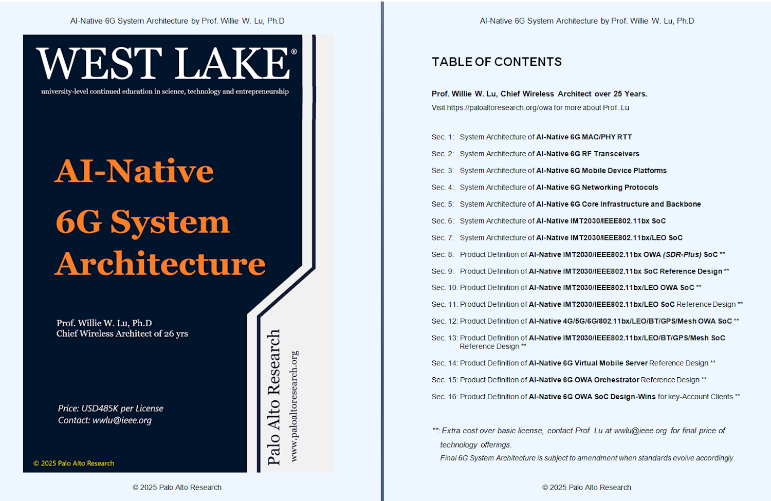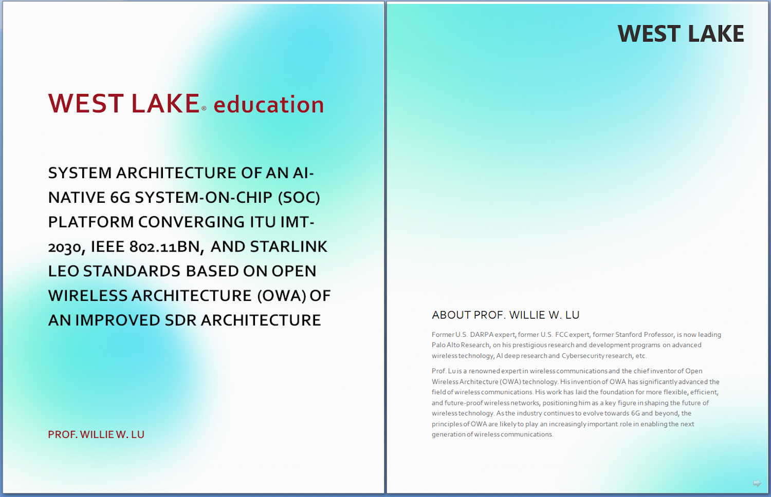 Chapter 9: Open Wireless Architecture (OWA) ¨C 2025 Consolidated Research Report 1. Executive Summary Open Wireless Architecture (OWA) is an end-to-end, fully-virtualized framework that decouples radio transmission technologies (RTTs) from operating systems and applications through a ¡°wireless virtualization layer¡± positioned between the PHY/MAC and upper-layer stacks. Invented and designed by Prof. Willie Lu at Infineon Technologies (as Chief Architect) and Stanford University (as Principal Investigator) since 1996 and continuously refined for about three decades, OWA now serves as the foundational enabler for 5G-Advanced, 6G, IoT, IoV and AI-native wireless networks. Its 2025 incarnation introduces three new planes¡ªIntelligence, Security and Sustainability ¡ª while delivering open, virtualized, programmable, shared and smart systems that are vendor-neutral, energy-efficient, AI-native and secure. 2. Historical Evolution & Research Trajectory The official development of OWA began in early 2000s at Stanford University under the leadership of Prof. Willie Lu, the PI. But the OWA was evolved from SDR (Software Defined Radio) project at Infineon Technologies where Prof. Lu was Chief Architect for the world¡¯s first SDR SoC ¨C X-Gold. The initial phase, from 1996 to 2002, saw the conception and early development of the SDR ->OWA framework with significant funding from Infineon and Stanford, etc. After that, Palo Alto Research continued to fund the OWA project, totaling over US$50 million. This period established the LU Model for RTT convergence, which laid the groundwork for future advancements of the OWA technology platform. From 2003 to 2010, the focus shifted towards product development and network implementation, resulting in a patent portfolio that includes US7826841B2. This phase formalized the virtualized abstraction layers, which are crucial for the flexibility and adaptability of the OWA framework. Between 2011 and 2019, OWA entered the commercial trials phase, where multi-RAT chipsets were developed and field-tested. This period saw the successful demonstration of coexistence and convergence of LTE, Wi-Fi, and mmWave, etc on a single SoC, showcasing the potential of OWA to unify diverse wireless technologies on a single platform. From 2020 to 2025, OWA has been further converging with Open-RAN, NFV, and AI/ML technologies, positioning itself as a backbone for future wireless networks. This period has seen significant advancements in integrating AI-driven optimization and AI-native virtualization techniques to enhance the performance and efficiency of wireless networks, especially the OWA-powered Virtual Mobile Server (VMS) is itself an edge acceleration node for ultra-low latency AI-data flow with trust over OWA wireless transport. OWA systems comprise Open MD (Mobile Device), Open RAN (Radio Access Network) and Open NI (Network Infrastructure). 3. Fundamental Architecture The OWA architecture is built around a virtualization layer that sits between the PHY/MAC layers and upper-layer stacks. This layer abstracts the underlying hardware, allowing multiple operating systems and applications to interact with various RTTs without being tied to specific hardware implementations. The virtualization layer provides a unified API that enables seamless communication and control across different layers of the network stack. In 2025, OWA introduced three new planes: Intelligence, Security, and Sustainability. The Intelligence Plane incorporates AI and machine learning capabilities to optimize network performance, mobility management and resource allocation, etc. The Security Plane enhances the security of the network through advanced cryptographic techniques, privacy enhanced technology and zero-trust principles. The Sustainability Plane focuses on reducing the environmental impact of wireless networks by optimizing energy consumption and carbon footprint. 4. Key Technical Features OWA's key technical features include multi-RAT convergence, dynamic spectrum management (DSM), energy-aware virtualization, open interfaces, ultra-low latency AI-data flow and cloud-native deployment. Multi-RAT convergence allows simultaneous operation of multiple radio access technologies on a single hardware platform, significantly reducing complexity and cost. DSM enables real-time allocation and dynamic migration of spectrum chunks among different RTTs based on traffic predictions, improving spectral efficiency. Energy-aware virtualization uses machine learning to minimize energy consumption per bit by selecting optimal RTT and PHY parameters for each data flow. Open interfaces ensure vendor neutrality and facilitate interoperability, while cloud-native deployment enables scalable and flexible network functions. The OWA wireless transport also enables very low latency AI-data flow with trust over wireless links of OWA-native RTTs. 5. Implementation Building Blocks The hardware implementation of OWA includes, but not limited to, a OWA baseband SoC with a 7 nm FinFET process, integrating 256-core vector DSPs, on-chip FPGA fabric, and NPUs for AI processing. The OWA RF front-end supports a wide frequency range from 600 MHz to 7.2 GHz, with plans to extend to higher frequencies in the future. The power envelope for the active multi-RAT mode is less than 800 mW, measured on 2024 test silicon. The software stack comprises several layers, including the OWA-HAL, OWA-Kernel, OWA-Orchestrator, and AI-Runtime. The OWA-HAL provides a unified driver interface, while the OWA-Kernel manages RTT scheduling, virtualization and adaptation. The OWA-Orchestrator handles Kubernetes operations for containerized network functions and DSM. The AI-Runtime supports TensorRT and ONNX-RT for edge AI acceleration and inference. 6. Use-Case Studies Tokyo XR Smart Venue In May 2025, OWA was tested and deployed at the Tokyo City, serving about 60,000 concurrent XR headsets powered by OWA solution with an aggregate throughput of 